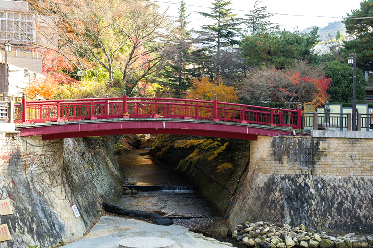 温泉街の風情を感じさせるねね橋。「ねね」は16世紀に生きた有馬温泉とゆかりの深い女性の名前 ©KOBE TOURISM BUREAU