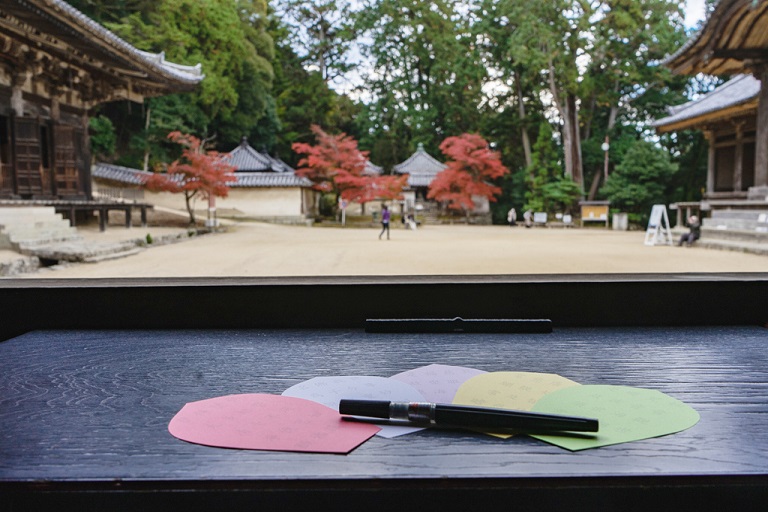 食堂では、花びら写経のワークショップに参加することができます。 参加者は、花びらの形をした紙で経文が印刷されているものを5色の中からから選ぶことができます。