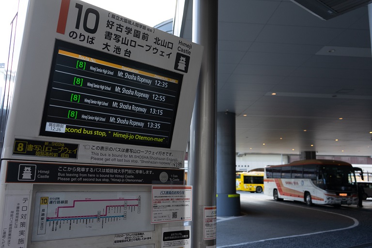 姫路駅からは、バス停10番から書寫山ロープウェイ行き、神姫バス8番を利用してください。書寫山ロープウェイバス停まで約30分かかります。このバスは、姫路城大手門バス停(姫路城の正面)でも停車します。