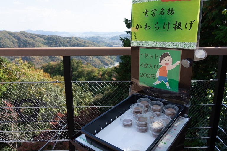 訪問者は、かわらけと呼ばれる小さな陶器をデッキから投げて運試しをすることができます。かわらけが的に命中すれば、願いが叶うと言われています。