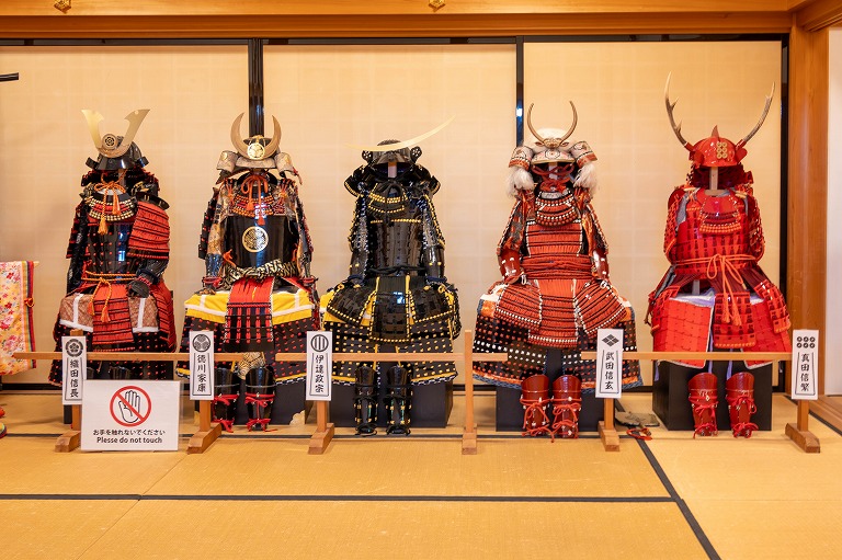 大書院の中には、戦国武将の甲冑が飾られていますが、実はこれは丹波篠山に住む甲冑作家が手作りしたもの! 緻密に作られた甲冑を間近に見たり、着用することもできます。