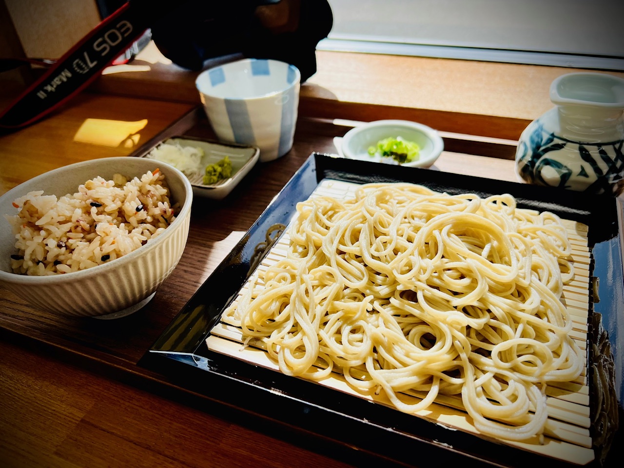 今回は、ざる蕎麦と混ぜご飯をオーダーしました。まずは、何もつけずにそばのみをいただきます。コシがあり、噛むほどにほんのりとした蕎麦の甘みを感じられます。