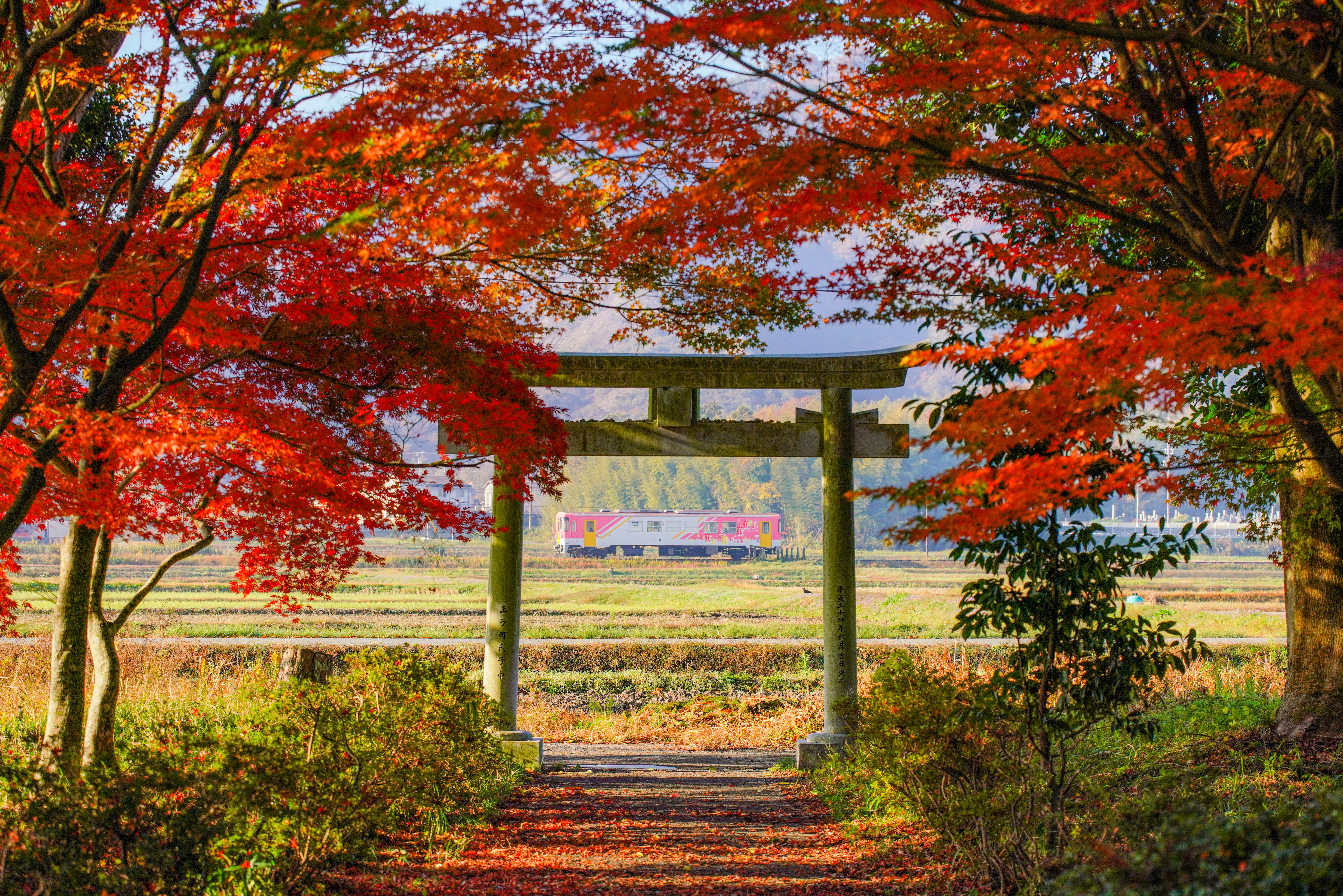 ▲紅葉に囲まれた鳥居の向こうには北条鉄道が