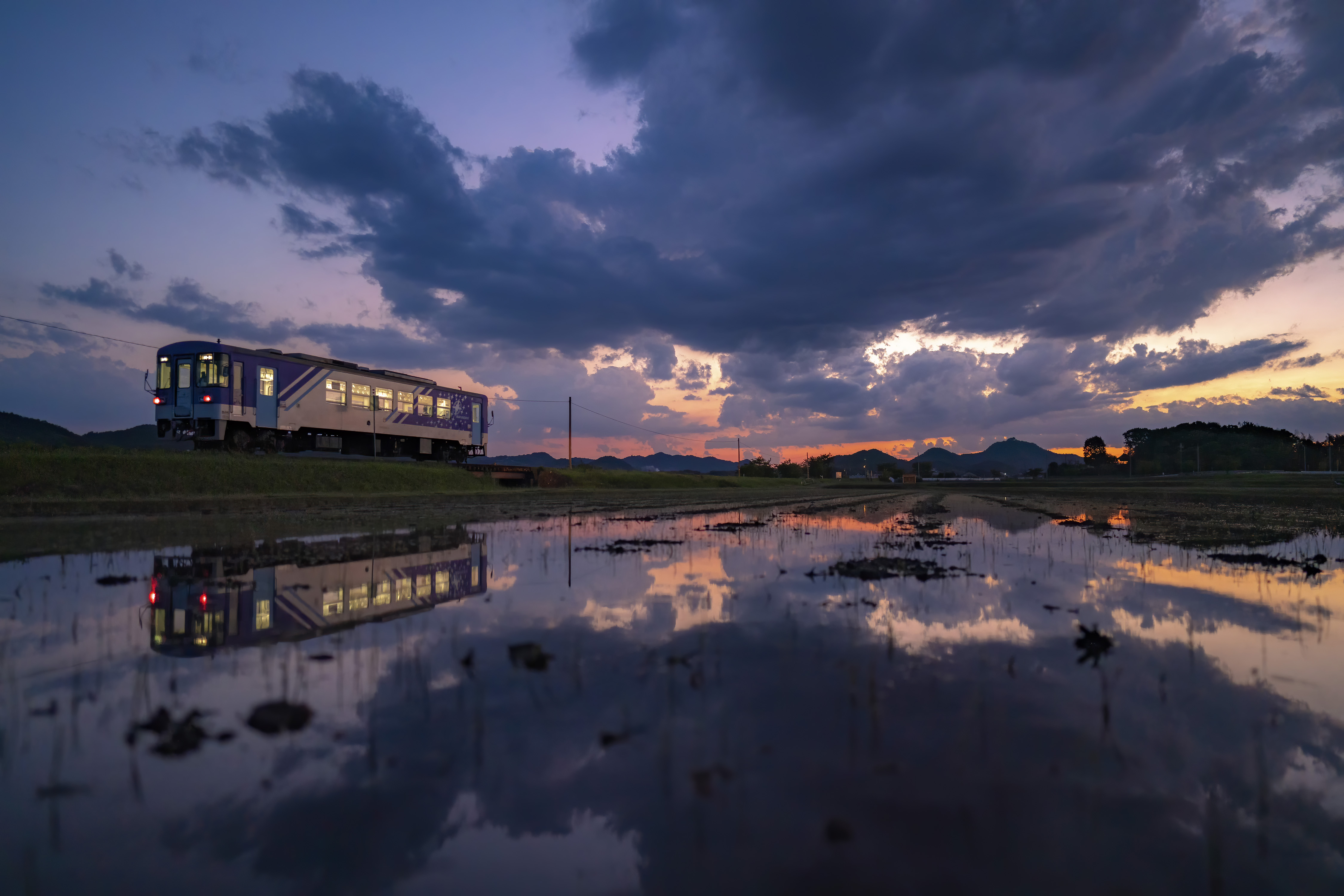 ▲夕暮れの田園風景のなかを走る北条鉄道