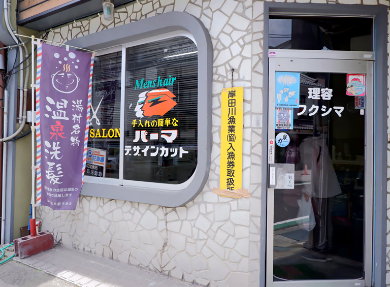 「温泉洗髪」ののぼりがあるヘアサロン5軒と理髪店4軒で受けられて、料金は1,000円前後。