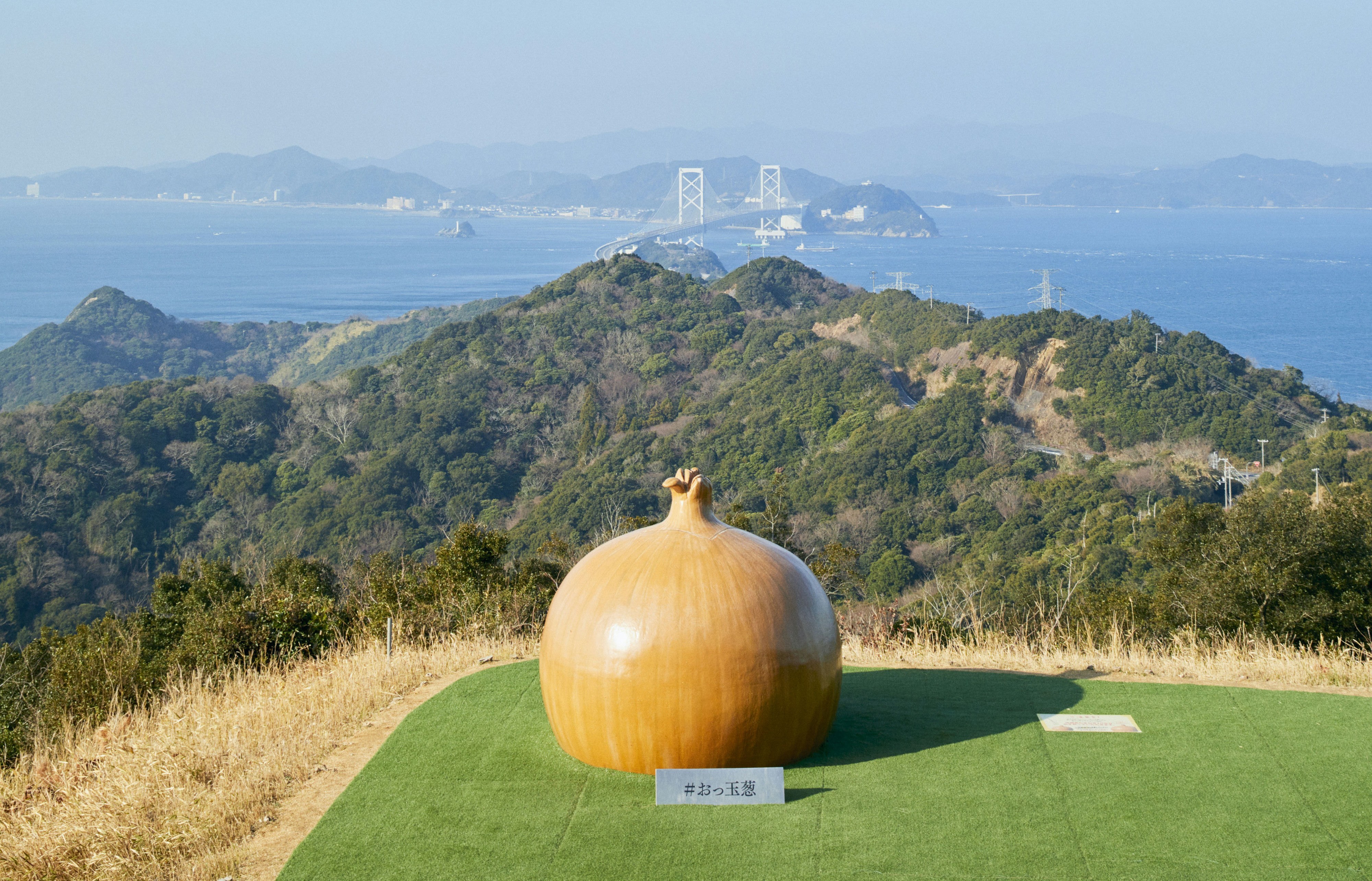 巨大な”たまねぎ”のオブジェ『おっ玉葱』。向こうには大鳴門橋と鳴門海峡が望める絶景スポット。