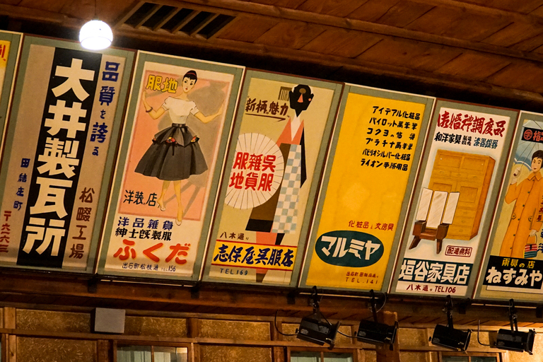 天井に飾ってあるレトロな手描き看板は、出石の看板屋さんによるもの。広告主はすべて地元の商店で今も営業しているところもあるのだとか。