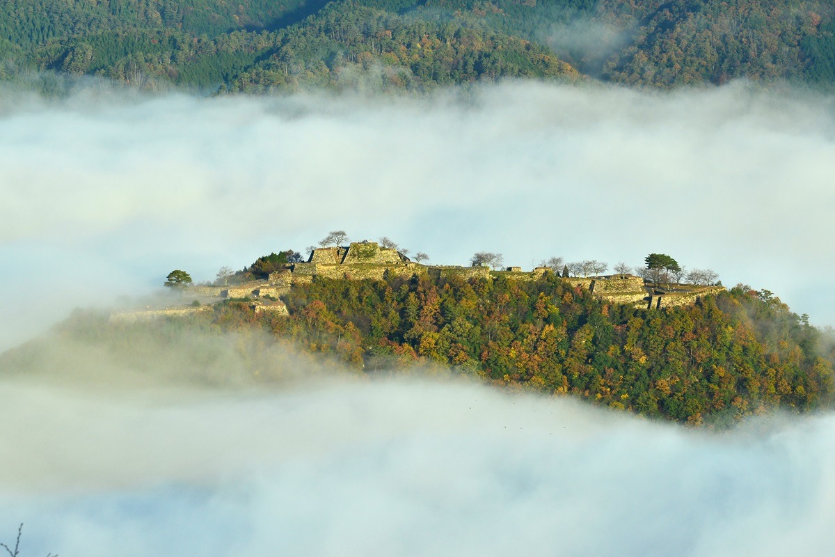 山のふもとの円山川(まるやまがわ)から湧き立つ霧が雲海のようになって竹田城跡を包む様子は、「天空の城」とも言われている。その神秘的な景色に出会えるチャンスは、晩秋のよく晴れた日の明け方から午前8時くらいまで。竹田城跡の天守台もしくは向かいにある朝来山の中腹にある自然公園「立雲峡(りつうんきょう)」から見るのが観光客に好評だ。行くときは、懐中電灯、レインコート、防寒具を忘れずに。