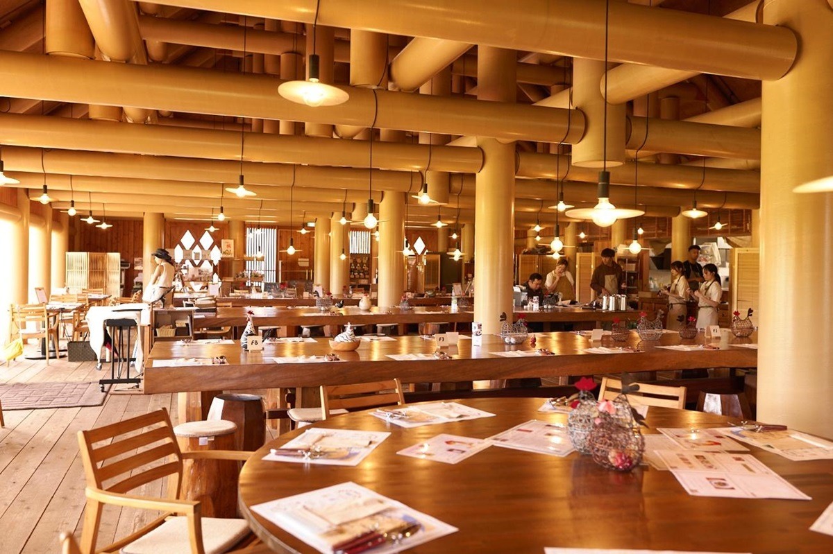 究極のファームトゥテーブル(農場から食卓へ)を目指しているという農家レストラン「陽・燦燦」は、畑のなかを歩くとたどり着く。店舗は、プリツカー賞を受賞した坂茂(ばん・しげる)氏が設計。紙管を使った災害時の復興住宅で知られる坂氏が、伝統的な茅葺き技法を生かしつつ、これまで開発してきた再生紙を使った紙管構造と最小限の木を用いたハイブリッド構造を採用。しっかりした構造でありながら、環境に配慮した軽快なクラフト空間となっている。
