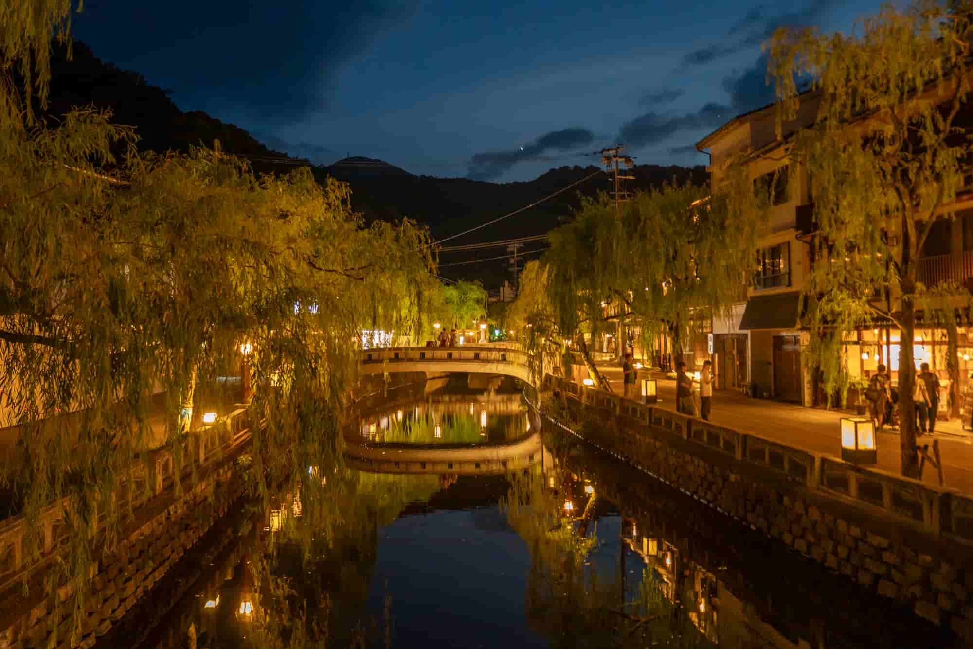 柳並木の大谿川(おおたにがわ)沿いに温泉街が広がる城崎温泉。