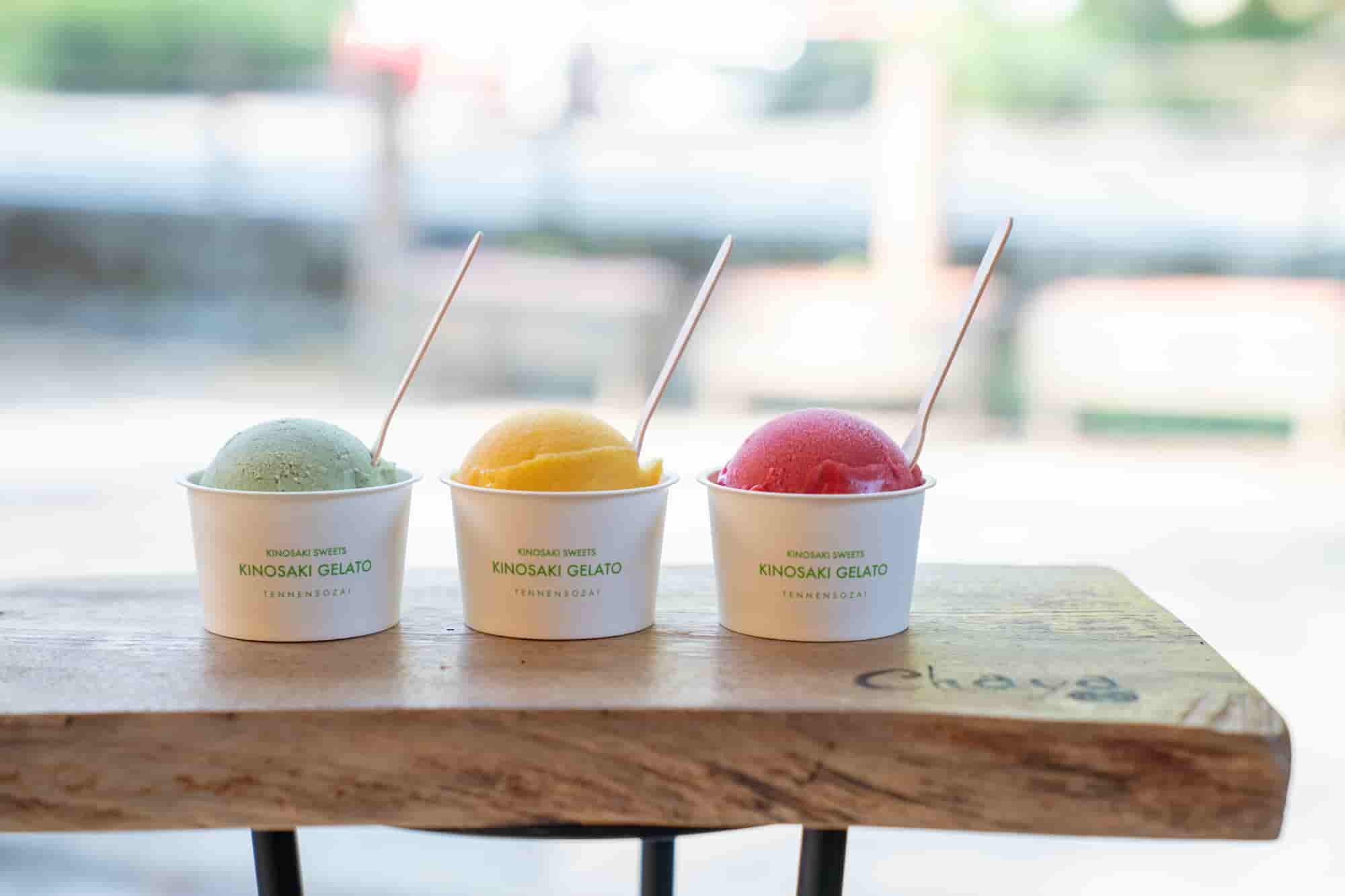 城崎ジェラート400円~。左から、黒豆よもぎ、マンゴー、木いちご。