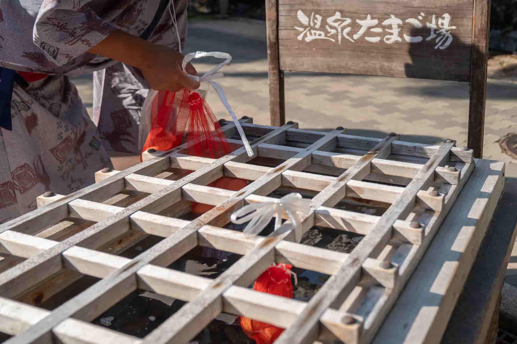 パーク内には城崎温泉の源泉である元湯が湧き出し、温泉たまご作りが体験できる。ここでの楽しみ方は、まず店内で新鮮な玉子を購入し、屋外の温泉たまご場へ。専用のネットに入れて源泉の中に沈めれば、約9分で温泉玉子が完成する。