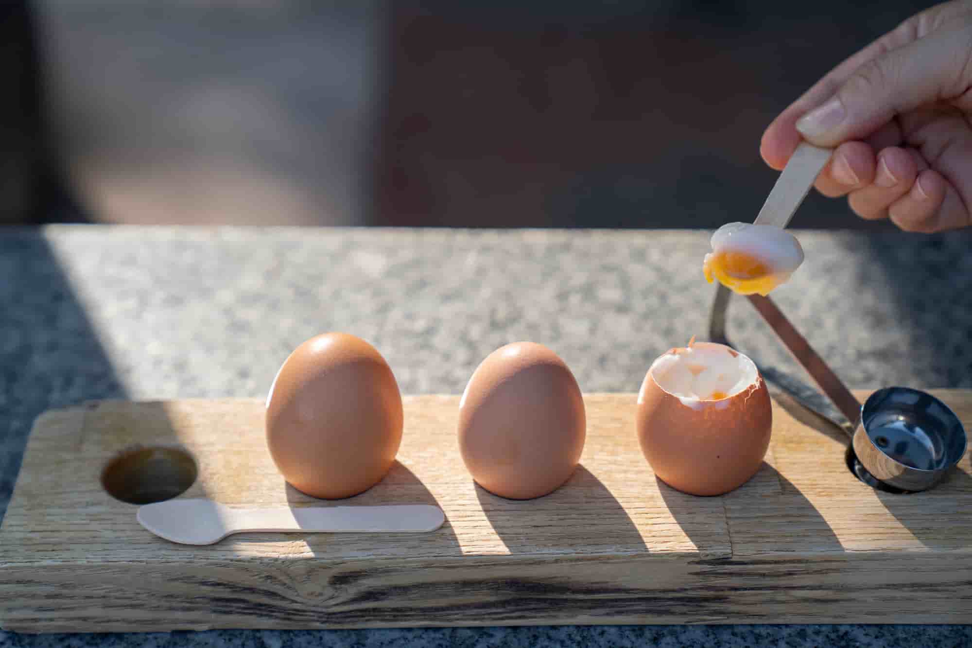 エッグカッターで玉子の上部を蓋のように外し、スプーンで味わう。