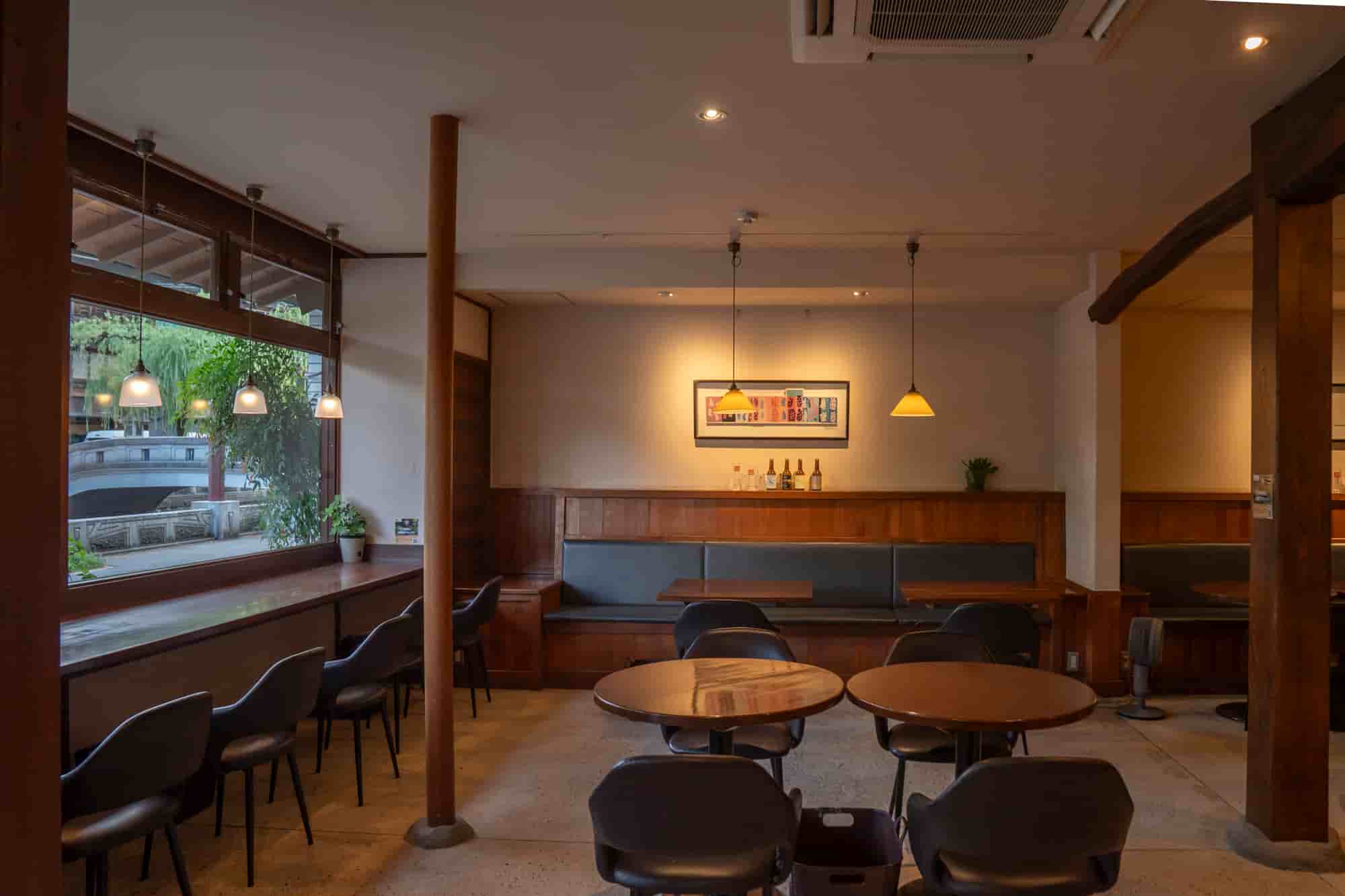 城崎温泉の町並みが眺められるカウンター席が人気。