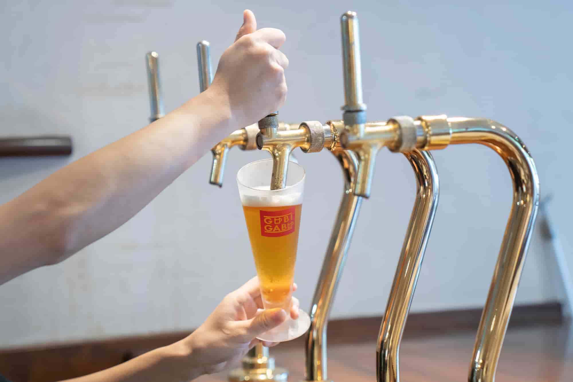 外湯めぐりの仕上げに立ち寄りたいのが、城崎温泉のメインストリートに立つ「地ビールレストランGUBIGABU」。湯上がりに浴衣のまま気軽に立ち寄れるカジュアルな雰囲気で、風情ある町並みを眺めながらクラフトビールが味わえる。
