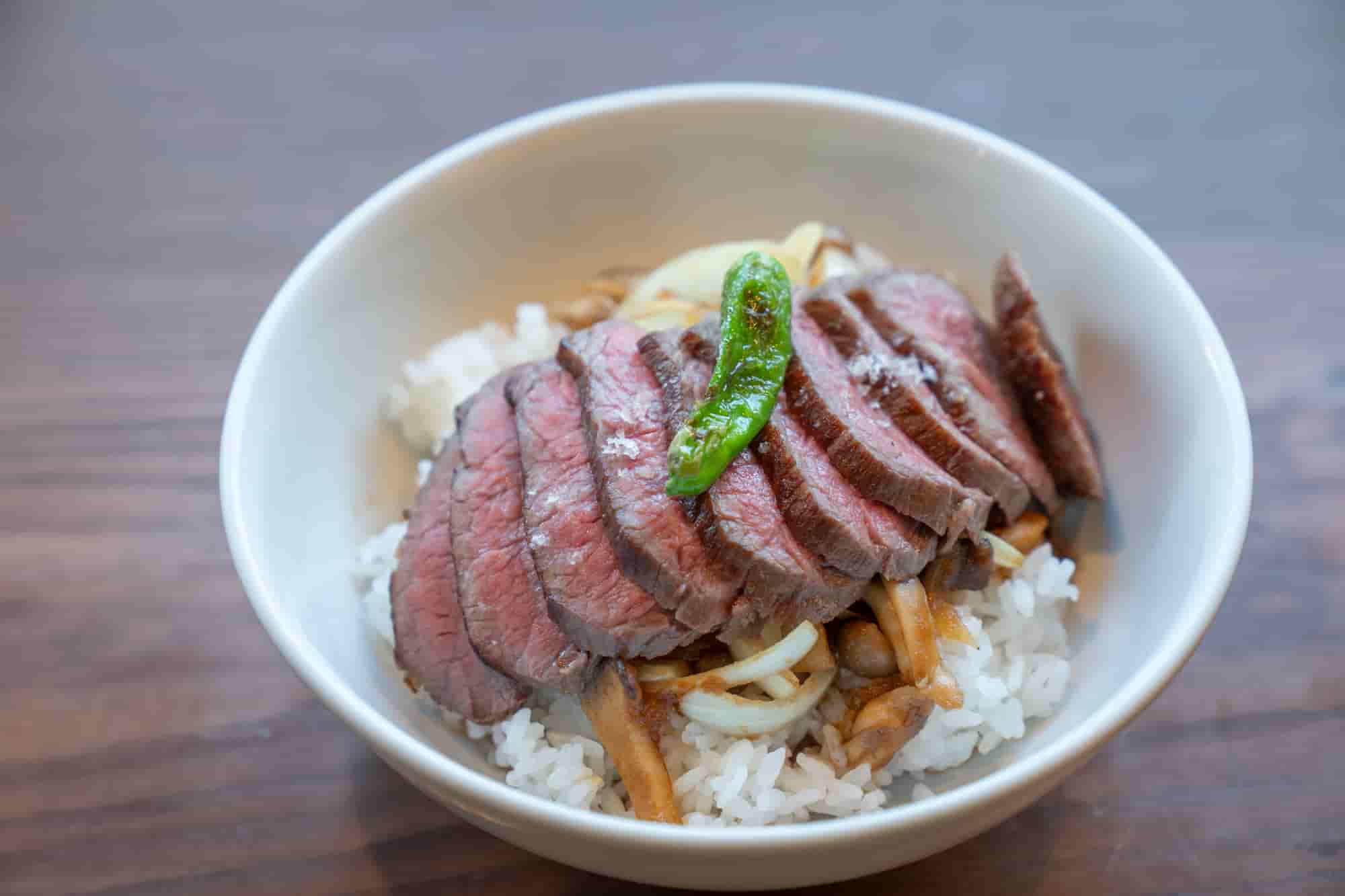 兵庫のブランド牛・但馬牛を使った「但馬牛のステーキ丼」は、ジューシーな肉の旨味を存分に堪能できる贅沢な一品。石窯で焼くピザは、温泉卵をトッピングしたビスマルクなど全8種類あり、どれもビールと相性抜群だ。