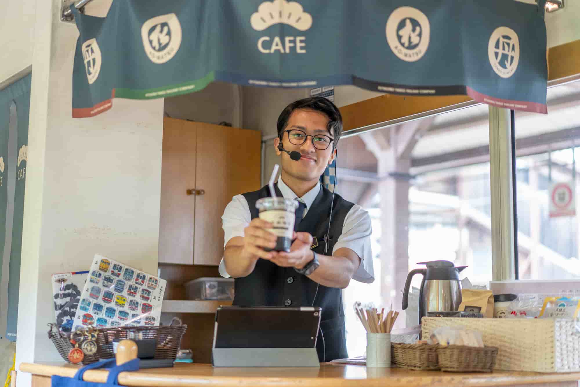 トレインアテンダントが乗務する区間では、車内カウンターでドリンクや軽食も販売。城崎珈琲焙煎所が焙煎したオリジナルブレンドの丹鉄珈琲をはじめ、地ビールや和菓子など沿線のおいしいものが揃う。