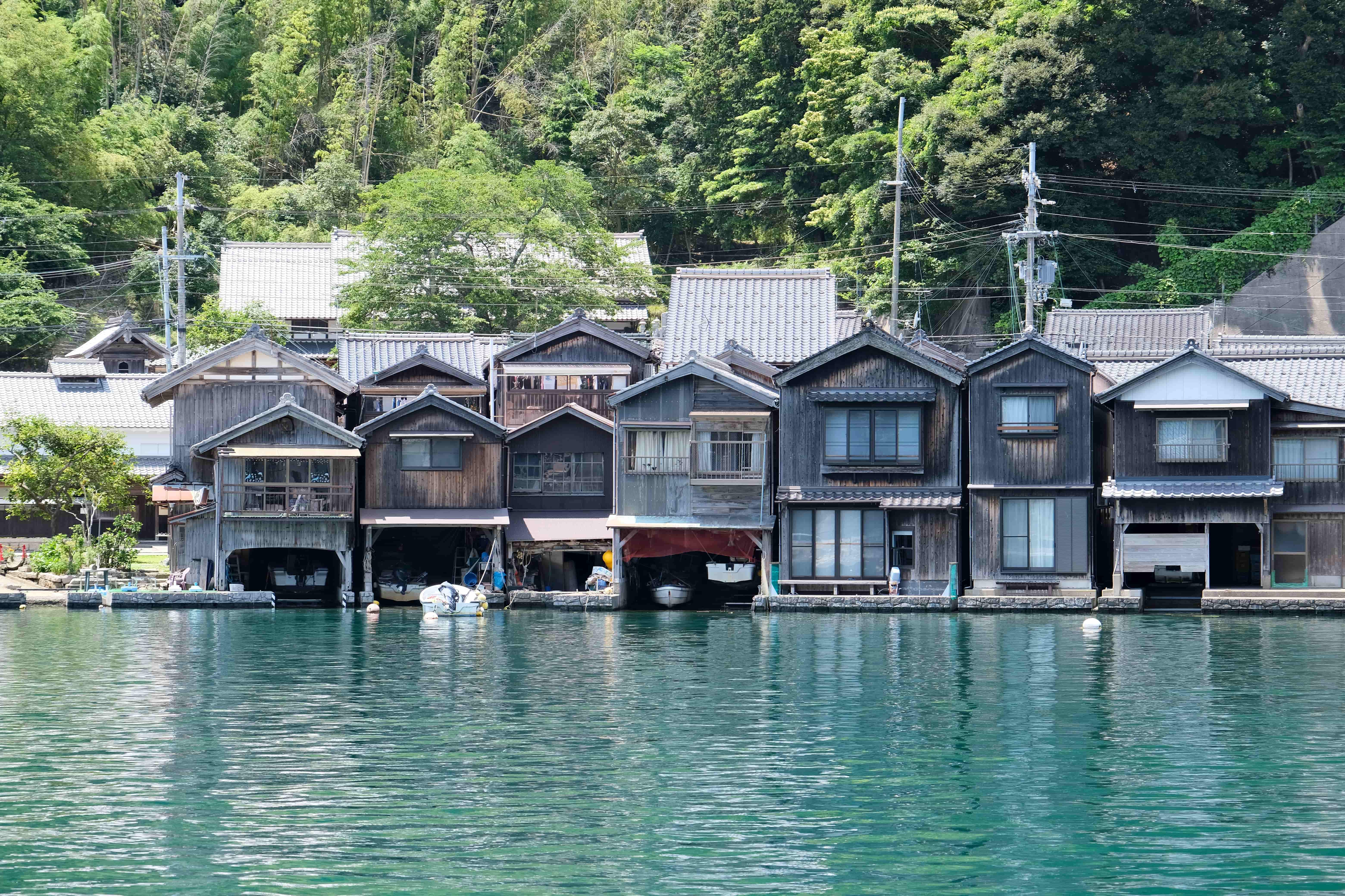 伊根湾に沿って立ち並ぶ「伊根の舟屋」。