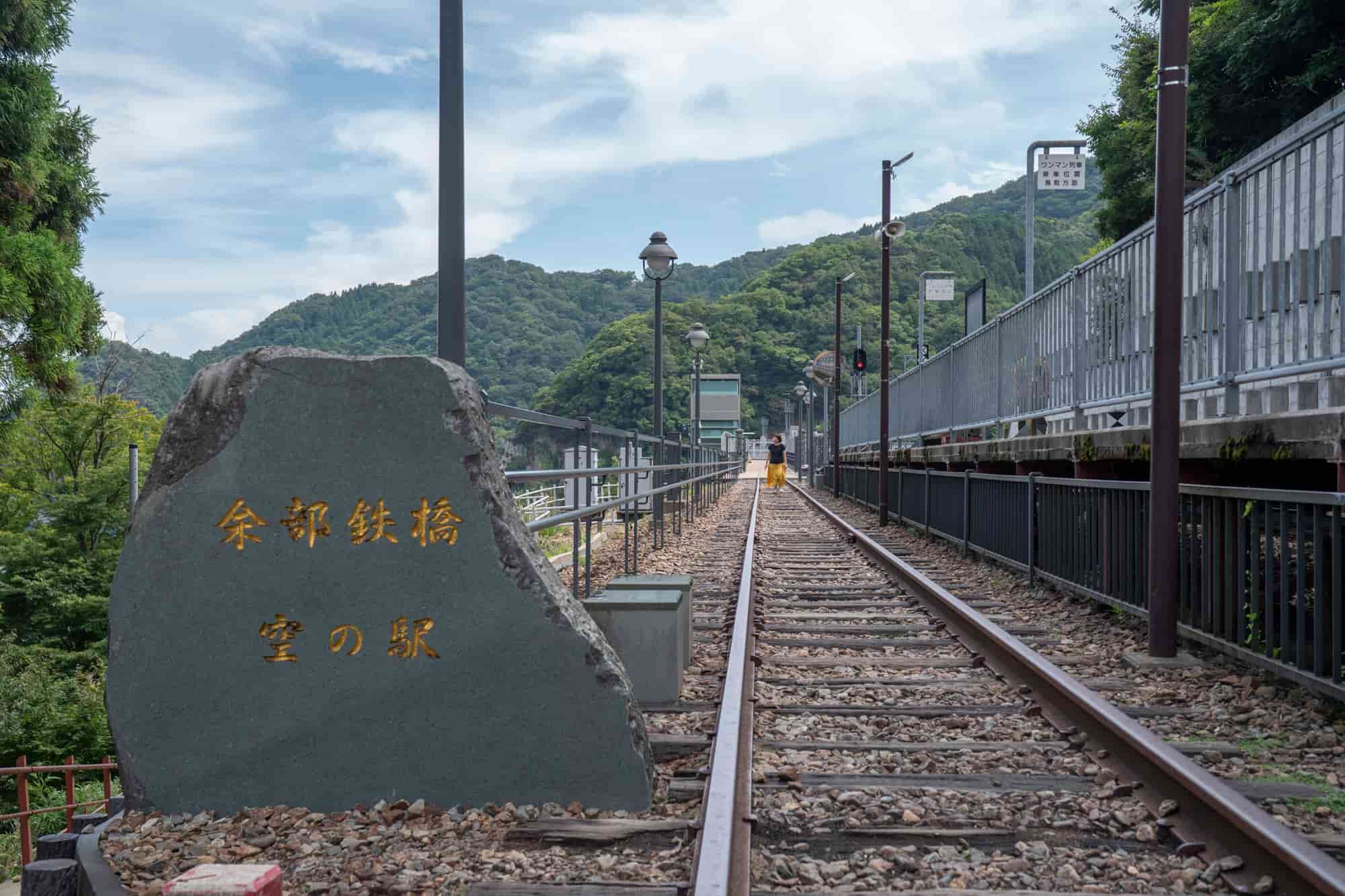 JR餘部駅から展望施設へは、ホーム脇に残された旧軌道を歩いて向かえば、かつて列車が走っていたレールの上を歩く体験ができ、鉄道ファンならずとも胸が高鳴る。