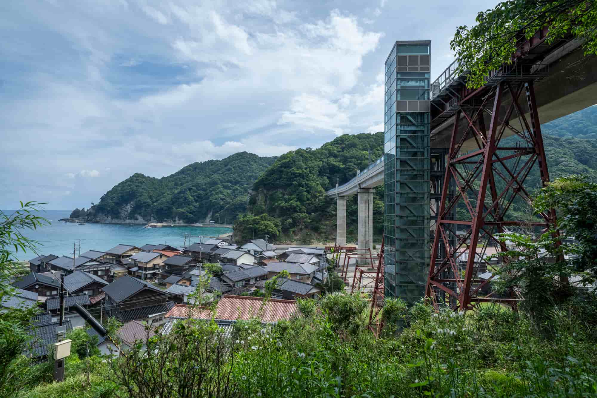 展望施設と地上をつなぐエレベーター「余部クリスタルタワー」は全面ガラス張り。日本海の大パノラマを眺めながら、約45秒の空中散歩が楽しめる。