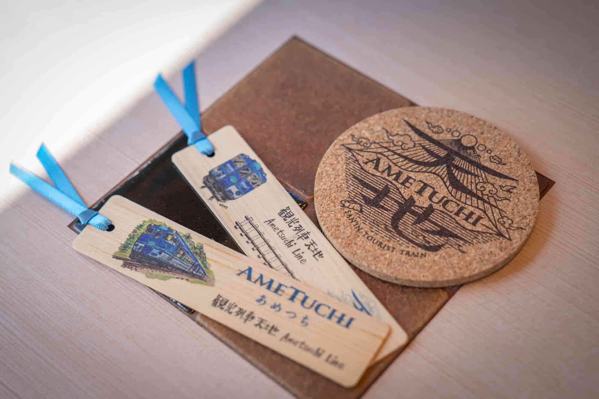 物販カウンターでは、山陰の地酒やおつまみ、お菓子のほか、車内限定のオリジナルグッズも販売。斐伊川和紙を使った便箋や封筒、木製のブックマーカーなど、旅の記念やお土産に最適だ。