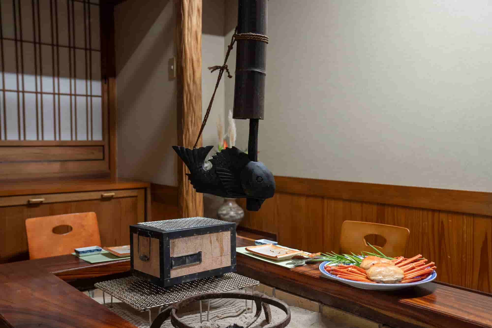 和の情緒あふれる囲炉裏の間。カニや海鮮を炭火焼で楽しめる。