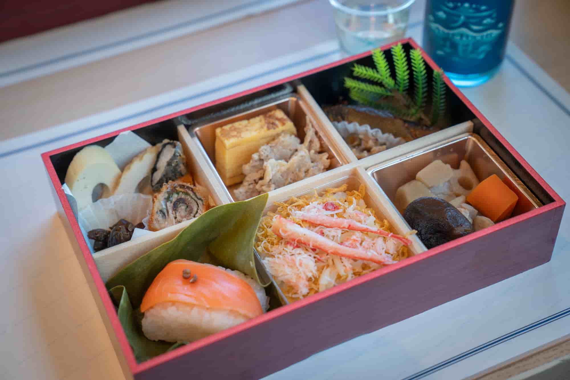 城崎温泉駅~鳥取駅区間を全線乗車すると、車内限定の「あめつち特製御膳」を味わう楽しみも待っている。カニの身をふんだんに使った駅弁で知られる「アベ鳥取堂」の名物・元祖かに寿しをはじめ、とうふちくわやアユの甘露煮、柿の葉寿しなど、鳥取の特産品や伝統食を一度に堪能できる。滋味深い郷土の味と地酒に舌鼓を打ちつつ、車窓から日本海を望む時間は、列車旅ならではの贅沢なひとときだ。