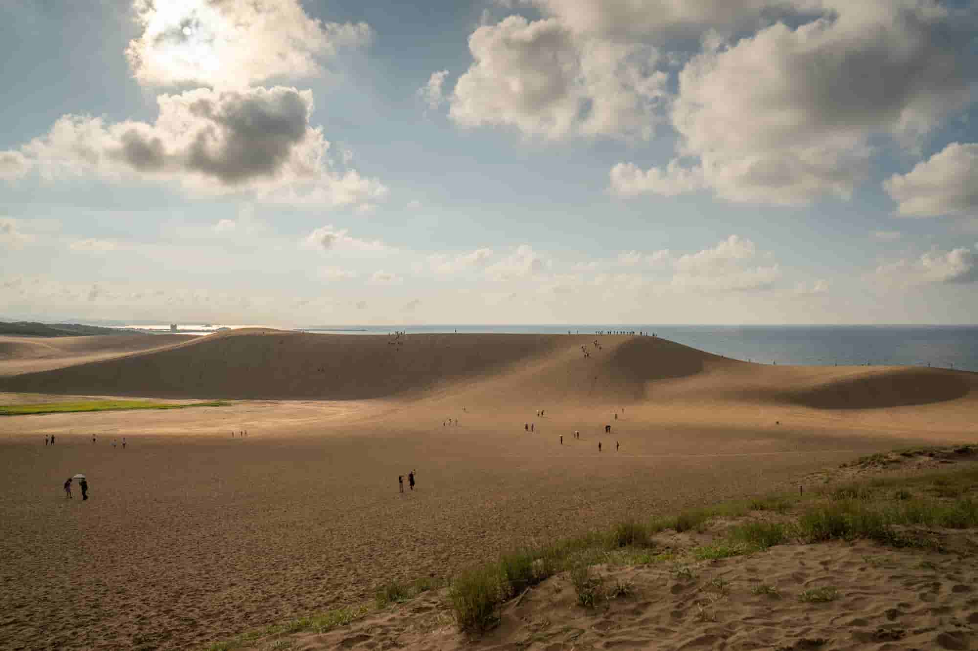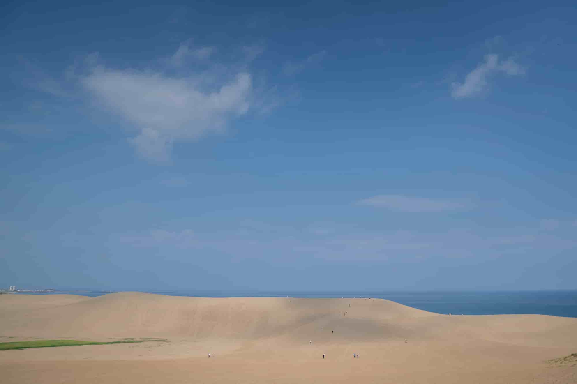 砂丘の入口から、一番の名所である高さ約47mの小高い丘「馬の背」までは直線距離で400mほど。頂上からは、美しい弧を描く日本海を一望できる。