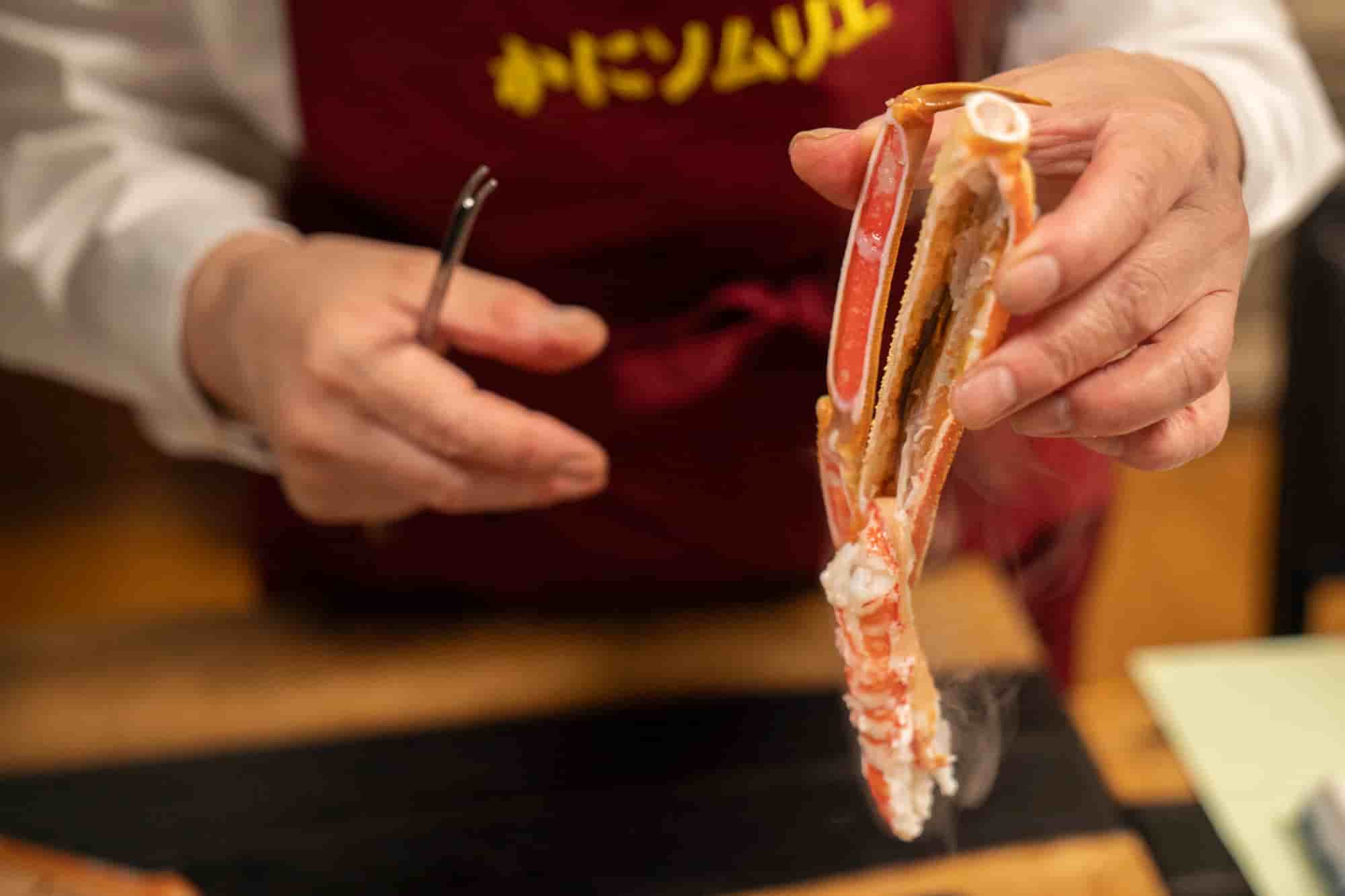かにソムリエが食べごろを見極め、むき方にも職人技が光る。