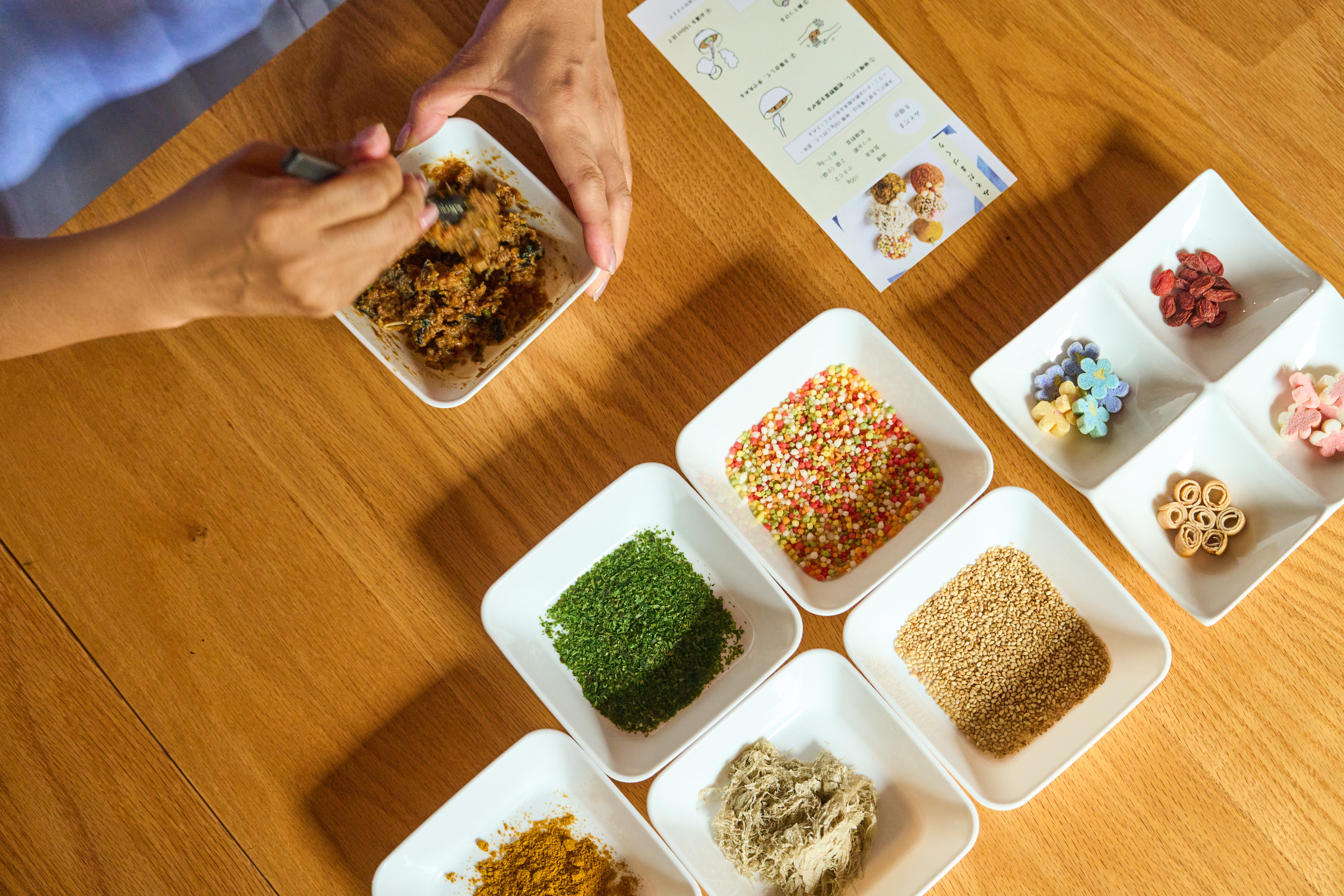 糀をたっぷり含んだ播州味噌に、天然乾燥野菜を加え、好みのトッピングを施せば、オリジナルのみそ玉が完成する。