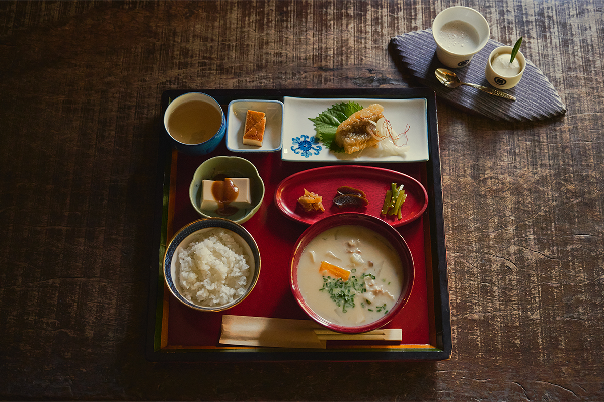 敷地内にはカフェやベーカリーも併設。カフェでは酒造りの副産物である吟醸粕を使った具だくさんの粕汁や、地元の食材を盛り込んだ「杜氏のまかない飯」(1,700円、ベジタリアン・ヴィーガン対応は2,200円)や甘酒スムージー(1,000円)など、発酵の恵みを堪能できるメニューが揃う。
