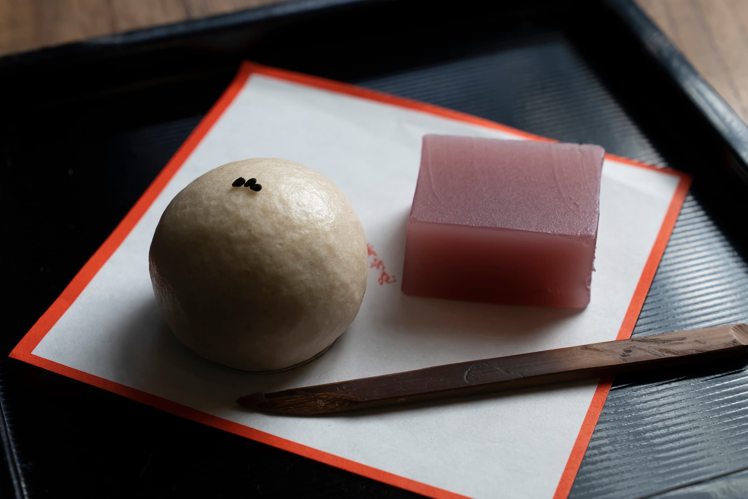 名物「醤油まんじゅう」(左)。隣は斑古(はんこ)ささげという希少な特産豆を使って作られる「煉羊羹」で、贈答品にもおすすめの上品な和菓子。