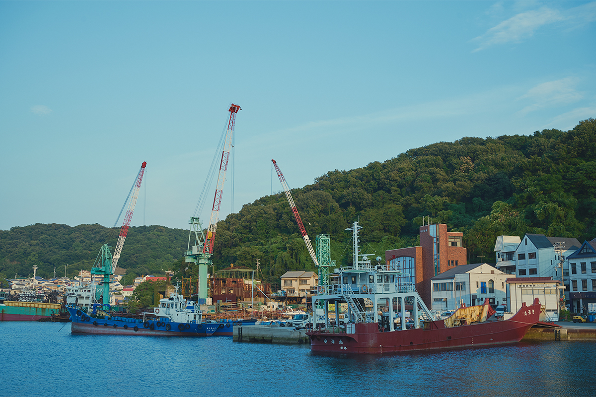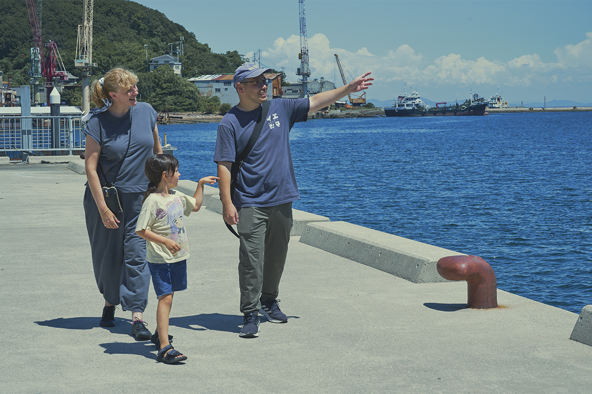 翌日は、いえしまコンシェルジュの中西和也さんと一緒に島内を散策。家島の港町には、どこか懐かしい昭和の風景が残る。対岸には、今も稼働を続ける採石の島々が見え、鉄の産業と豊かな自然が共存する独特の景観が広がる。静かな時間の流れの中に、島の息づかいを感じられる場所だ。