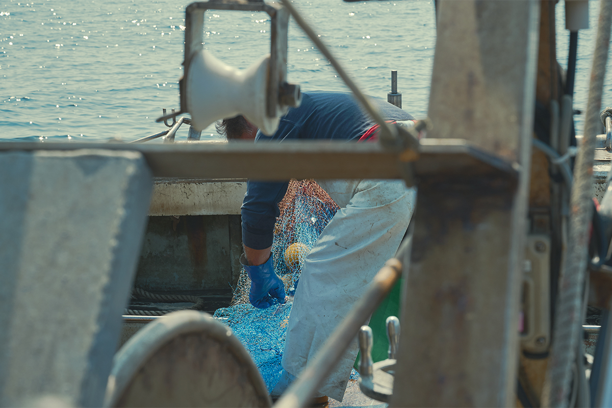 漁師・森さんの船に乗り込み、坊勢島や男鹿島、西島といった家島諸島を横目に眺めながら、約40分かけて沖合へ。海に網を沈めて20分~45分ほど(季節により時間は変動)船で引っ張ると、漁師さんの合図でいよいよ引き揚げの瞬間。ずっしりとした重みに胸が高鳴る。「さて、今日はどんな魚が獲れたのだろう?」。