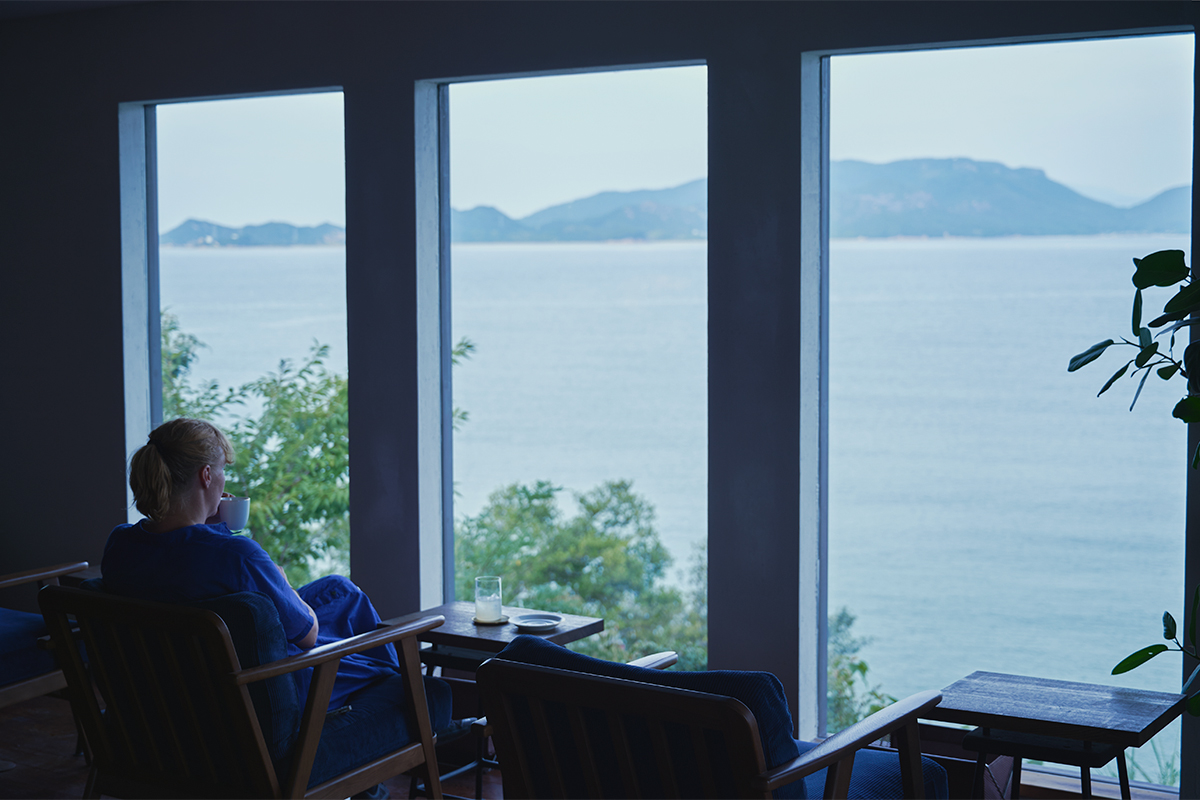 大きな窓いっぱいに広がるのは、瀬戸内の海を借景にした絶景。カップを手に、ただ何もしない時間を過ごす——そんな贅沢がここでは叶う。