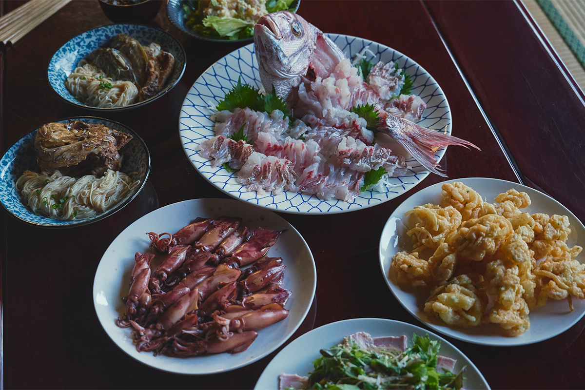 漁業体験のあとは体験付き宿泊施設「家島ハレテラス」で、家島の料理名人に教わりながら、獲れたばかりの魚で島ごはんを作る。今晩のおかずは、ヒイカとウボゼの煮付け、タイの刺身、小エビと玉ねぎのかき揚げ、島では祝い事で食べるというタイを煮付けた汁に素麺を絡ませた「タイソーメン」。