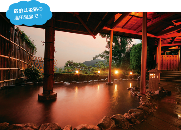 効能豊かで良質な温泉を求め、江戸時代には各地から多くの湯治客が訪れた名湯。一帯は夢前川と播磨の山々に心癒やされるのどかな風景が広がります。現在は2つの旅館が営業しており、どちらも趣向を凝らした浴場が魅力です。