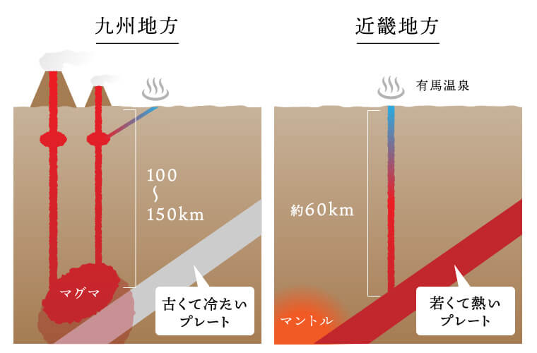 同じフィリピン海プレートが沈みこむ条件下でも、九州には活火山が多く、近畿にないのは、プレートが形成された年代が違うためです。九州地方は、5000万年前以前にできた古いフィリピン海プレートが沈み込んでおり、地下100〜150kmの辺りでプレートの水分が放出されることで、マントルが融け、マグマが生成。大量のマグマが多数の火山を作り、それによって火山性の温泉が多く湧き出ています。