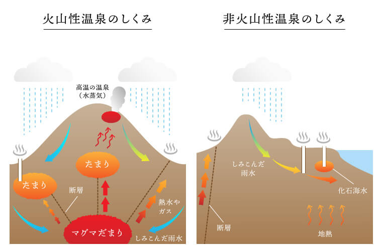 また、同じ兵庫県内でも城崎温泉や湯村温泉は神鍋山や玄武洞など数十万年前の火山群に起因した火山性温泉であり、火山性・非火山性の2タイプの温泉が共存しているのも兵庫の大きな特徴です。