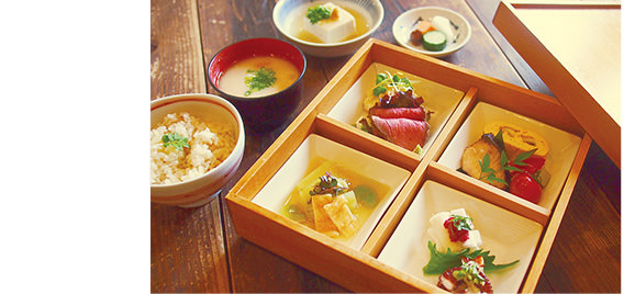 播磨地域の野菜をふんだんに使った弁当は四季で内容が変わり、4種の前菜、豆腐、粕汁、季節のご飯、香の物がセット。13時30分からのカフェタイムでは「こうじアイス」「酒まんじゅう」など自家製スイーツが人気です。