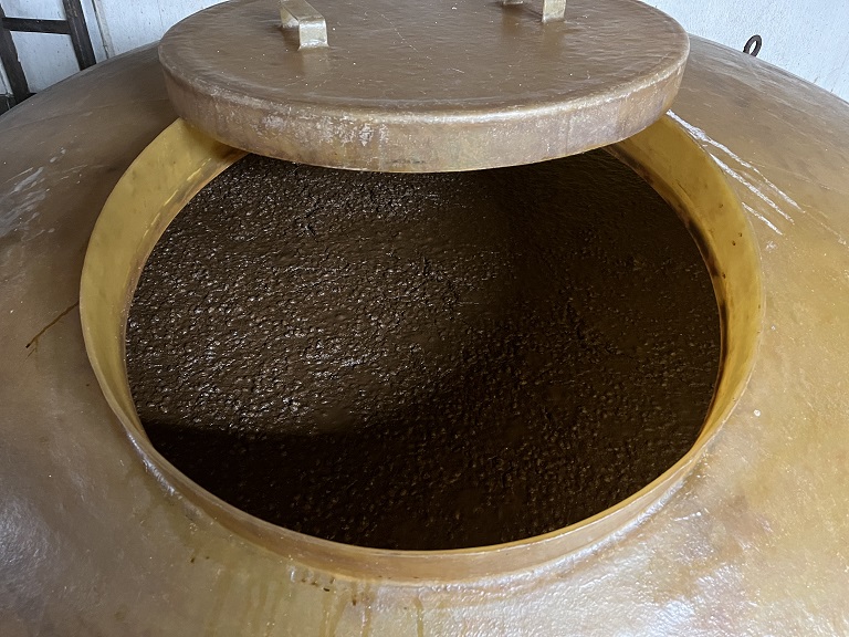 こちらは3年仕込みのもろみ。通常は1年半から2年でもろみは搾られますが、長期熟成醤油のための特別なもろみです。色は深く、香りは醤油そのもので、既に主要な発酵は終わりじっくりと熟成の段階に入っています。