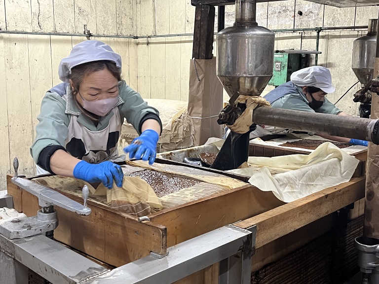 もろみを搾る作業は、手作業で布にもろみを延ばしていくため非常に手間がかかります。もろみが詰められた布を幾重にも重ね、それをじっくりとプレスすることで、搾りだされた醤油が下に溜まっていきます。