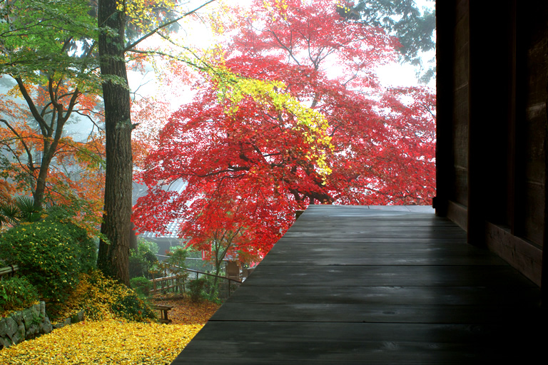 「大国寺」の境内では、まずイチョウが色づき、落葉するとまるで黄色の絨毯のような光景が見られます。さらに多数植栽されているイロハモミジがとても鮮やかな赤に変わるため、赤と黄色のコントラストが圧巻です。