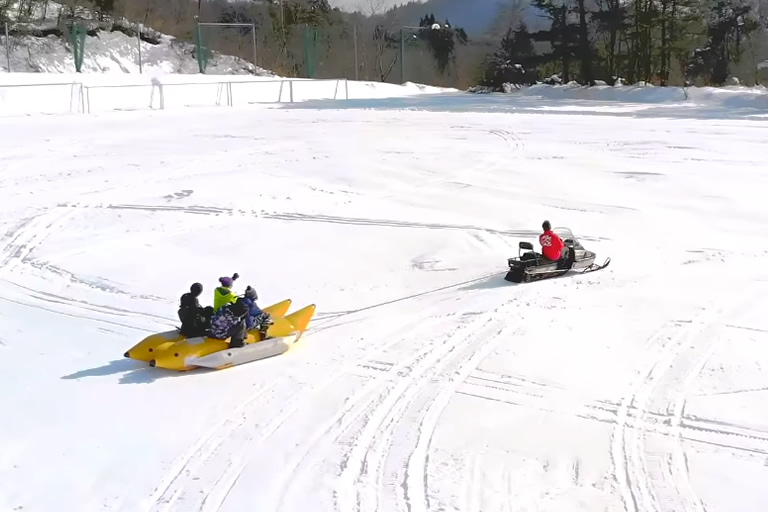 別途料金が必要ですが、中央ゲレンデでは雪上バイク「スノーモービル」で専用コースを駆け巡ったり、うえ野平ゲレンデではスノーモービルに引っ張られたボートに乗って雪上を疾走するスリル満点の人気アクティビティ「スノーラフティング」の体験もあって、親子でスペシャルな体験もできます。