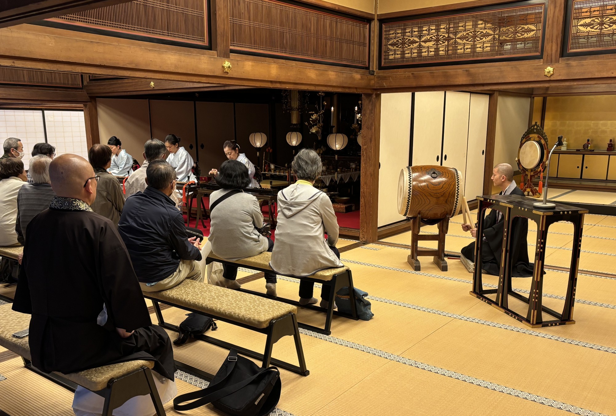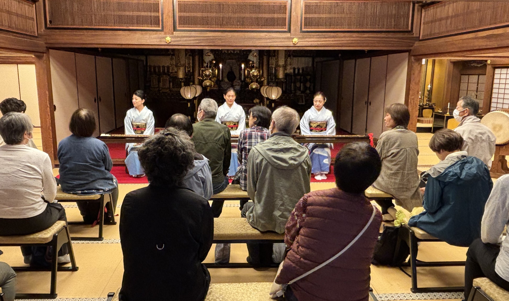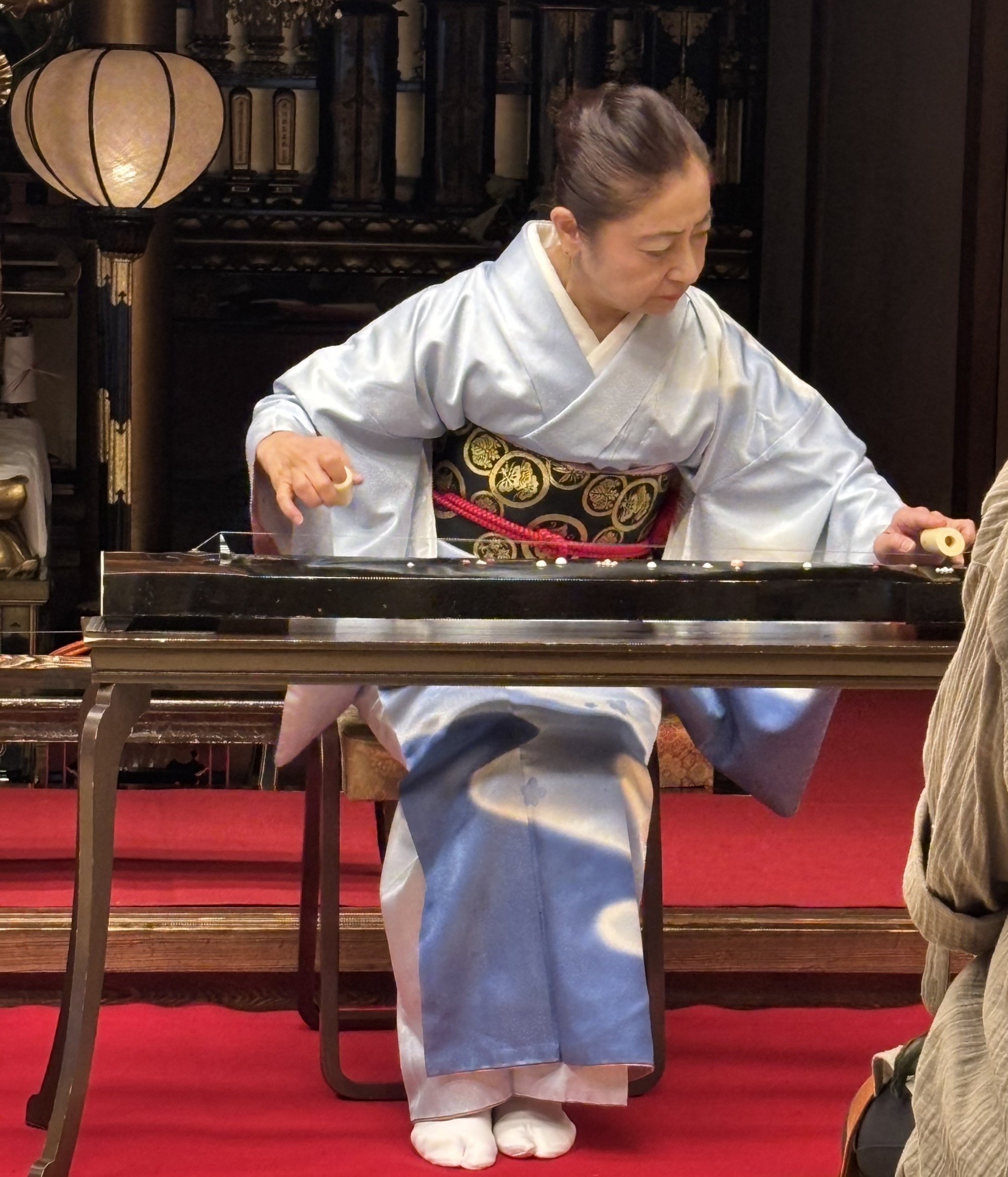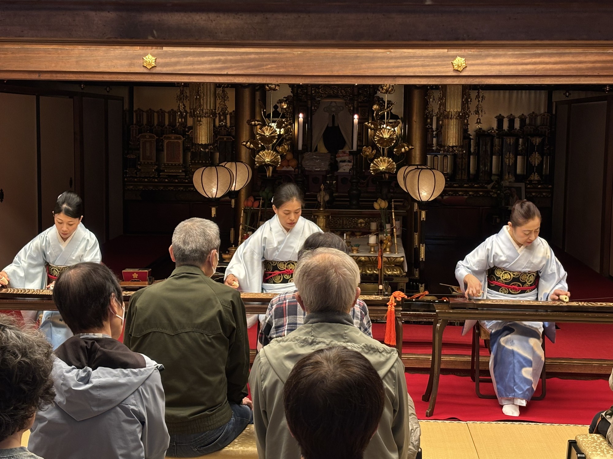 小池副住職も加わり、一本の絃から奏でられているとは思えない情緒ある琴の音と迫力ある太鼓のコラボ演奏が披露されます。