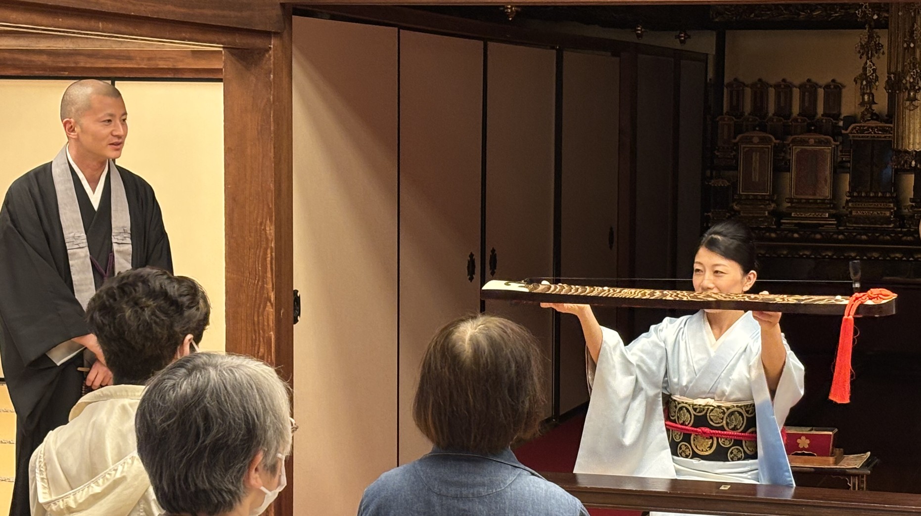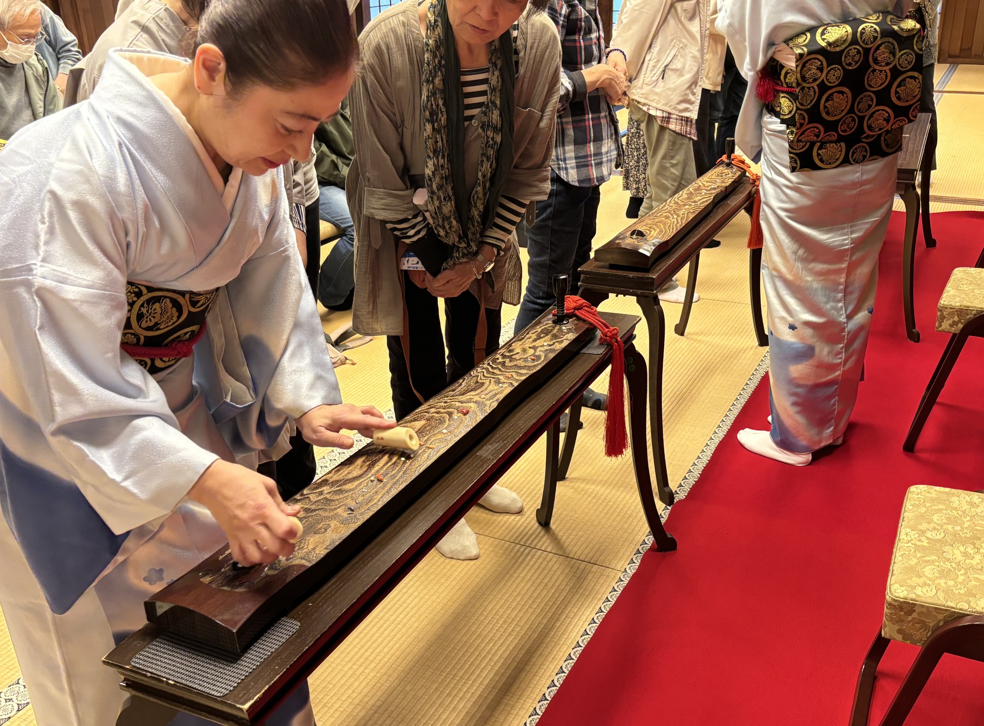 須磨寺での最初のおもてなしは、須磨寺ゆかりの一絃琴(須磨琴)です。保存会の方々が着物姿でお出迎えしてくださいます。