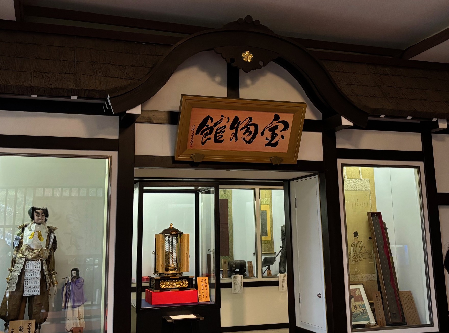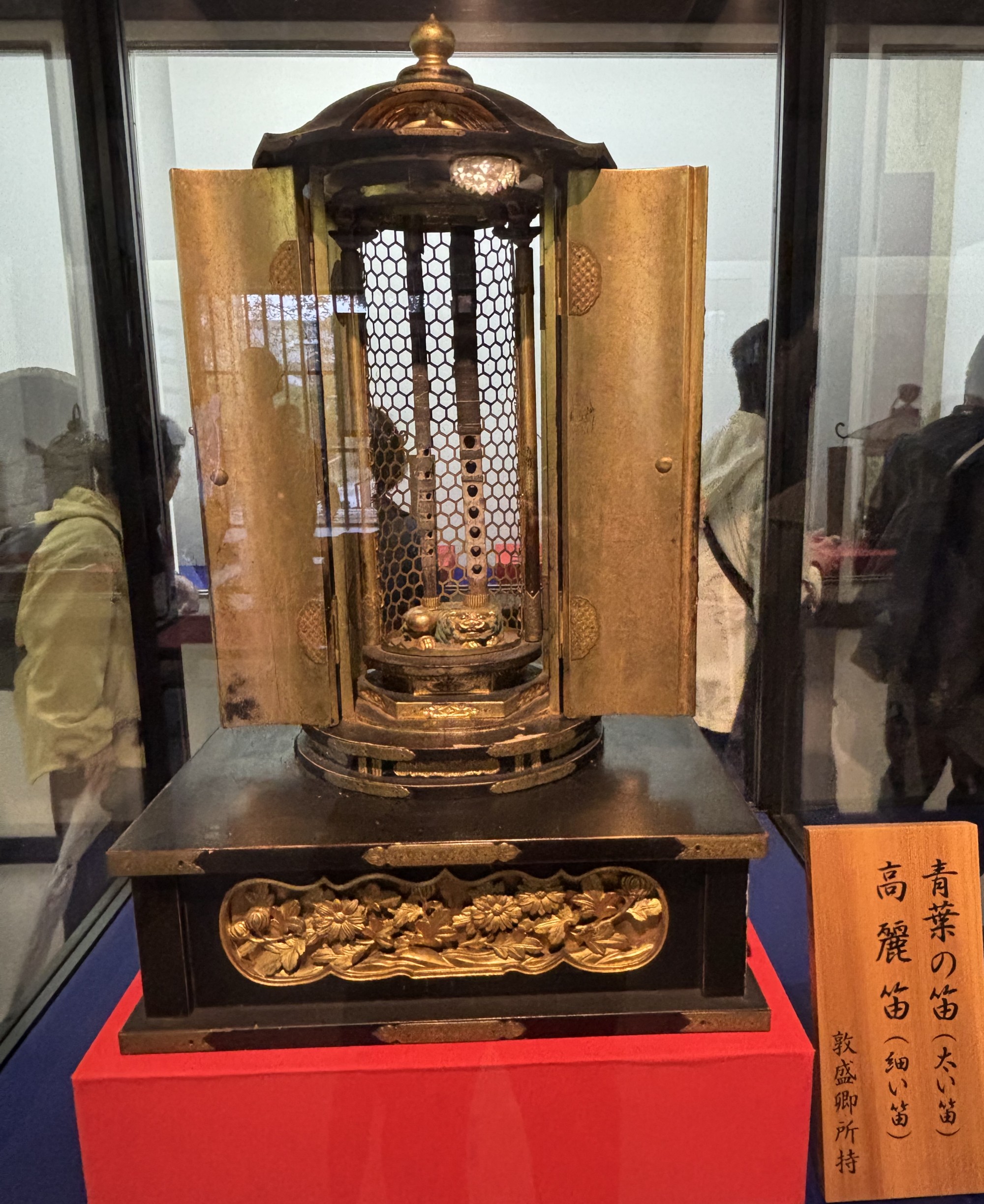 それから宝物館へ。入口すぐのところに、さきほどお話をお聞きした青葉の笛が飾られています。熊谷直実が平敦盛を討ち取る物語はどこかフィクションにも聞こえる美しさと哀しさをもっていますが、こうして笛を眺めていると、笛の音で我が身を癒しながら、戦の世に散っていった実在する若き敦盛を想い、胸が締め付けられます。