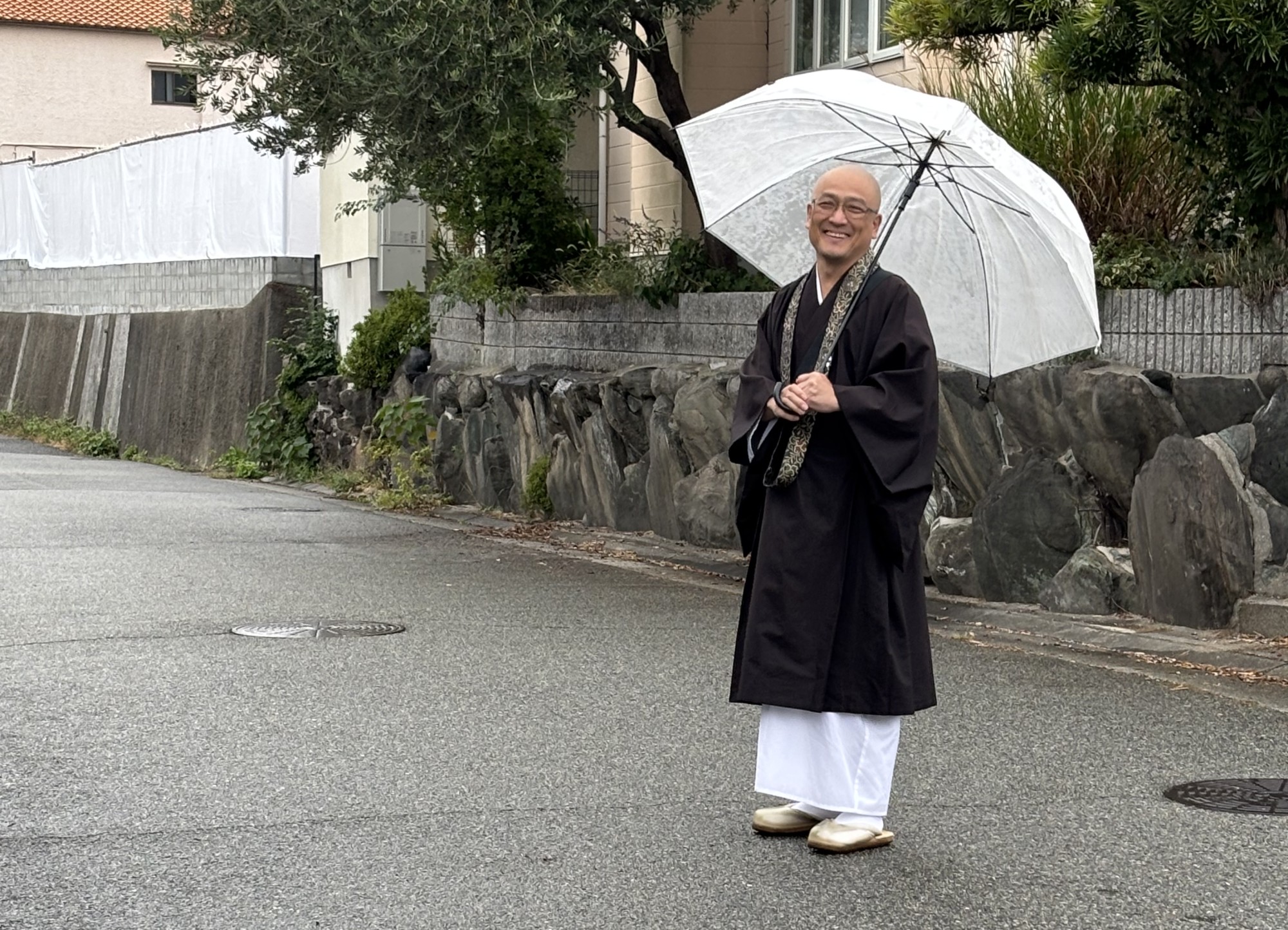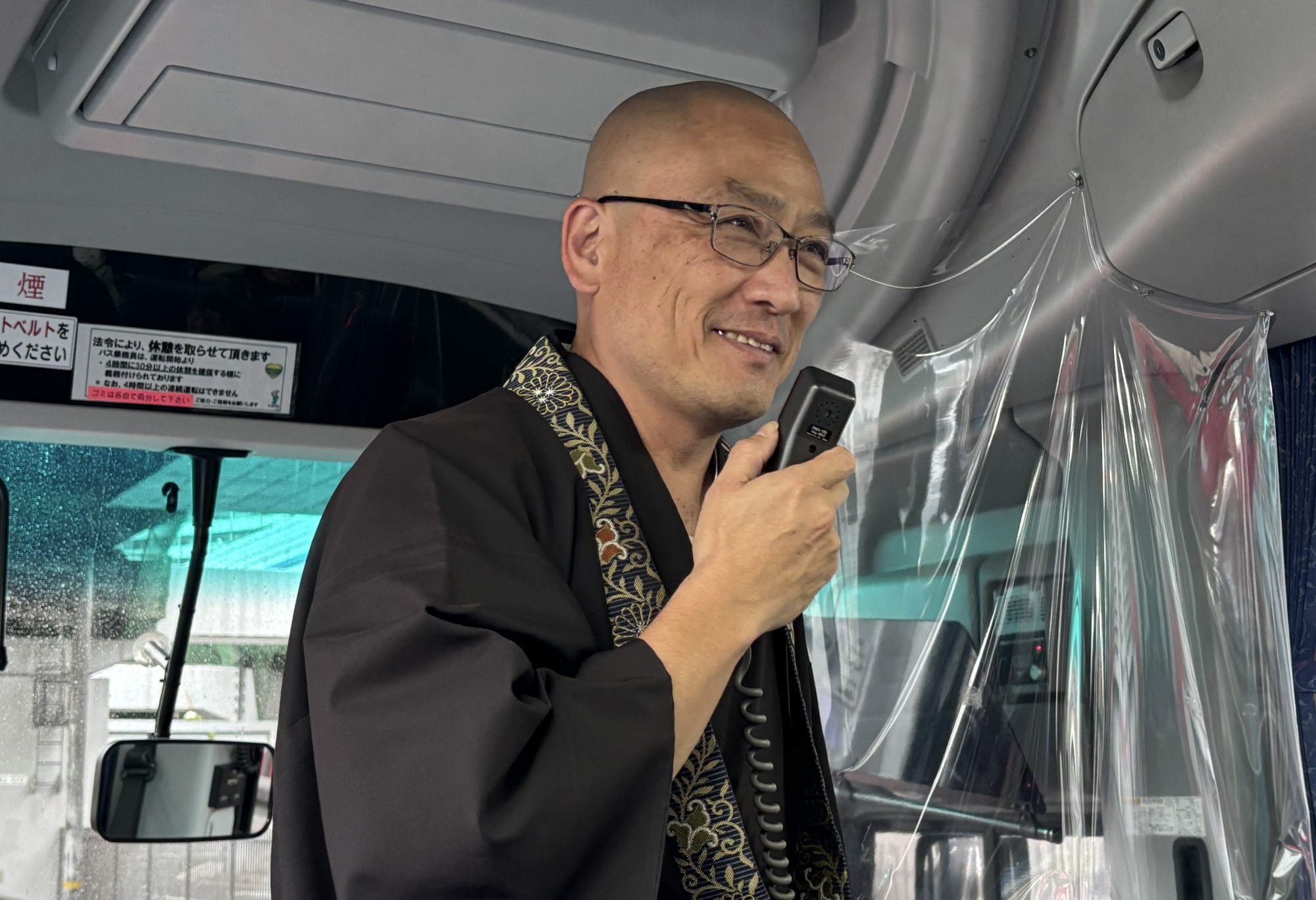 帰途につくバスに乗り込む際、満面の笑みで参加者をお迎えする能福寺・雲井住職。このバスツアーがリピーターに支えられ、長年続くのは、訪問先となるお寺での特別で心のこもったおもてなしと、ガイド役となる雲井住職のファンが多くおられるからではないかと感じました。