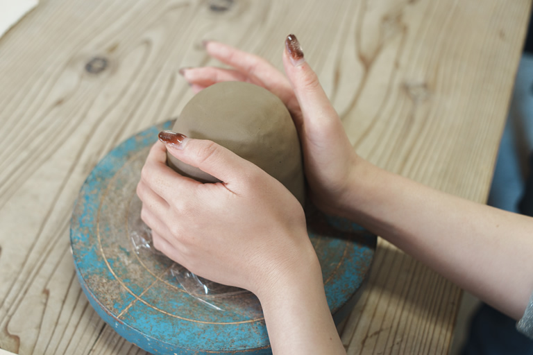 丸めた粘土を石膏型の上で伸ばし、壺の形を作っていきます。