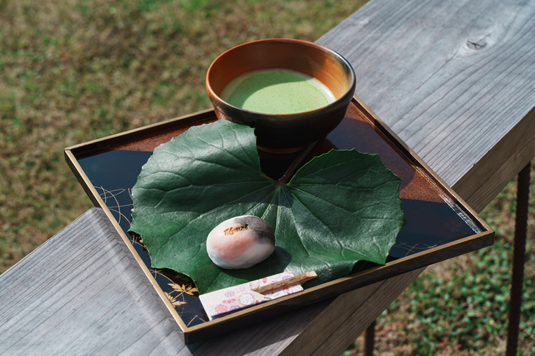 陶芸体験の後は、雲⽕焼の器でお抹茶とお菓子で一服。お菓子は雲火焼をイメージした桃井ミュージアムのオリジナルなんですよ。